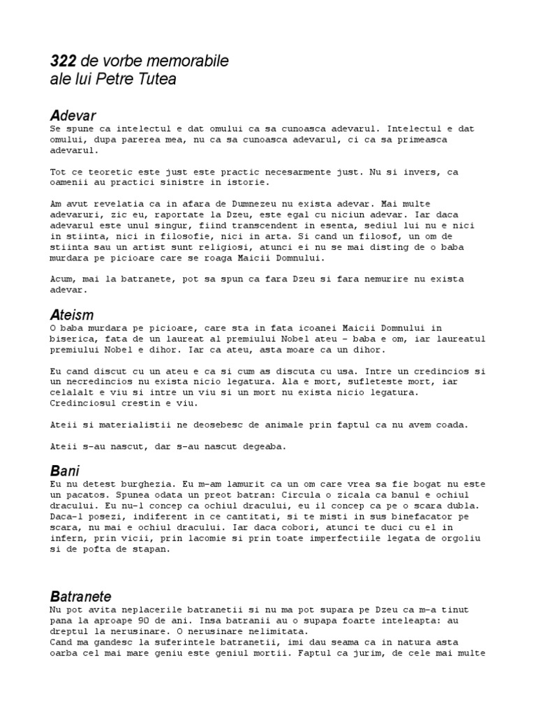 322 de vorbe memorabile ale lui petre țuțea. Am regăsit intr un colt de biblioteca volumul de citate 322 de vorbe memorabile ale lui petre ţuţea si am fost din nou șocat din păcate nu in același mod admirativ. Petre tutea was born in a family of a priest. Ii respect in continuare suferințele din perioada regimului comunist dar nu îl pot accepta ca un filozof. A very popular book sold in more than 70 000 copies is 322 de vorbe memorabile a collection of aphorisms taken from various interviews ordered alphabetically.
