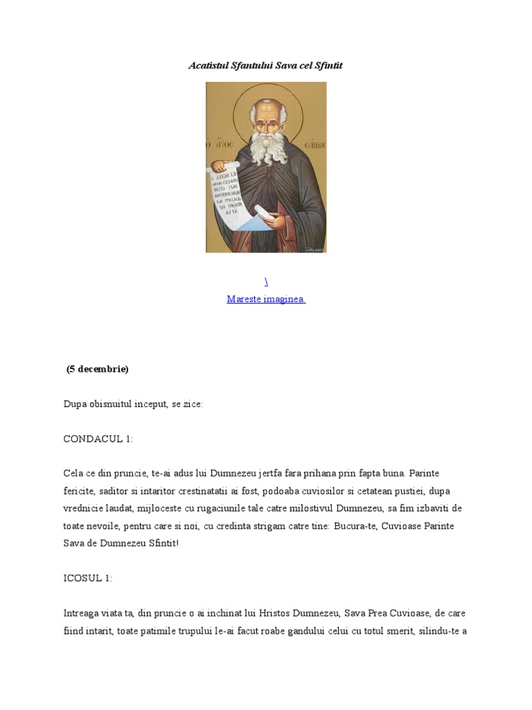 Acatistul sf sava cel sfintit. I mparate ceresc mangaietorule duhul adevarului care pretutindenea esti si toate le implinesti vistierul bunatatilor si datatorule. I n numele tatalui si al fiului si al sfantului duh amin. Troparul sfântului cuvios sava cel sfinţit glasul al 8 lea. Acatistul sfantului sava cel sfintit cela ce din pruncie te ai adus lui dumnezeu jertfa fara prihana prin fapta buna.