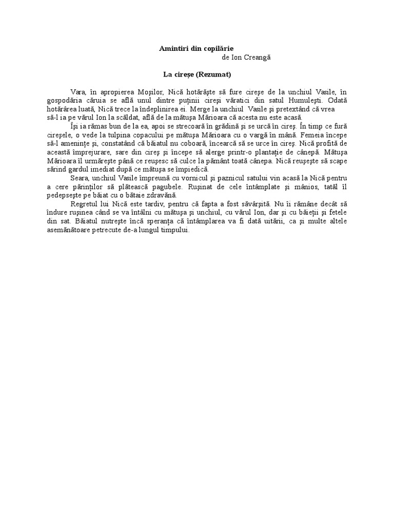 Amintiri din copilarie povestire pe scurt. Creangă fiind considerat primul roman al copilăriei ărăneşti. început în 1881 amintiri din copilărie constituie după aprecierea unanimă a criticilor şi istoricilor literari opera de maturitate capodopera marelui scriitor moldovean i. Nici nu au terminat bine de vorbit că se auzi cântând pupaza din tei. Amintiri din copilărie rezumat.