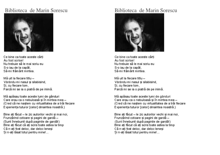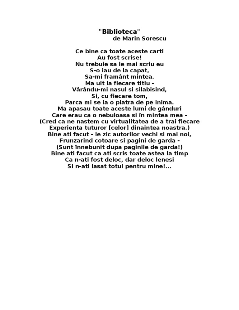 Biblioteca şcolară marin sorescu a organizat ca în fiecare an în data de 19 februarie activităţi dedicate poetului marin sorescu n. în 1966 primește premiul uniunii scriitorilor pentru volumul poeme reușind să repete această performanță de încă 5 ori pe parcursul carierei sale. Poezia biblioteca de marin sorescu ce bine ca toate aceste carti au fost scrise. 7016783 bveverita22 așteaptă ajutorul tău.