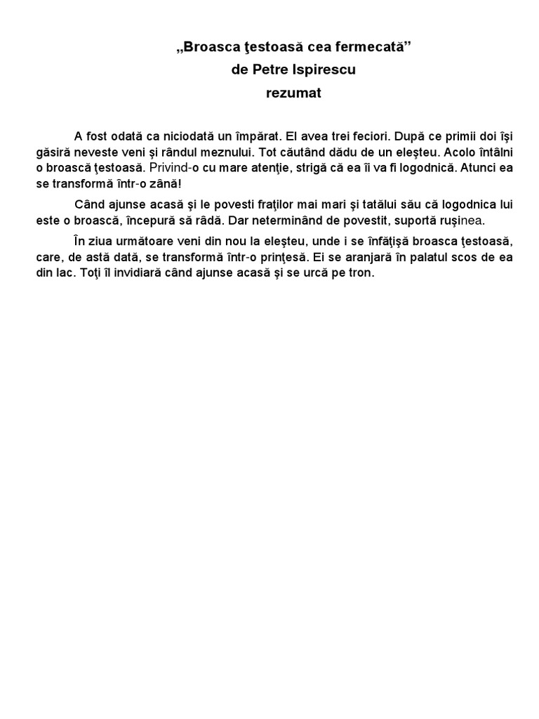 Când le a venit şi lor vremea de însurătoare le a zis împaratul. Puteti gasi foarte multe referate accesand categoriile din partea dreapta despre rezumat broasca testoasa cea fermecata uita te mai jos si o sa gasesti cele mai relevante rezultate pentru cautarea rezumat broasca testoasa cea fermecata. Dragii mei copii v ați facut mari. Vorbele tale tata sunt pentru noi ca o icoana la care ne închinam raspunsera copiii și dupa ce îi sarutara mana se gatira care mai de care sa.