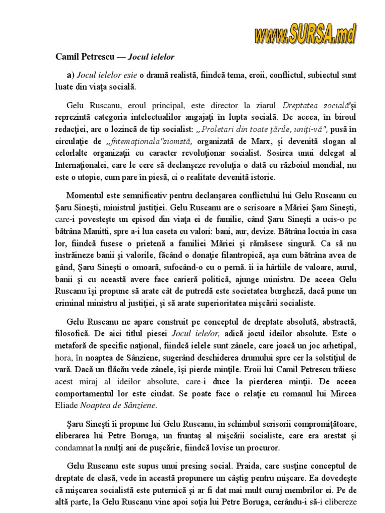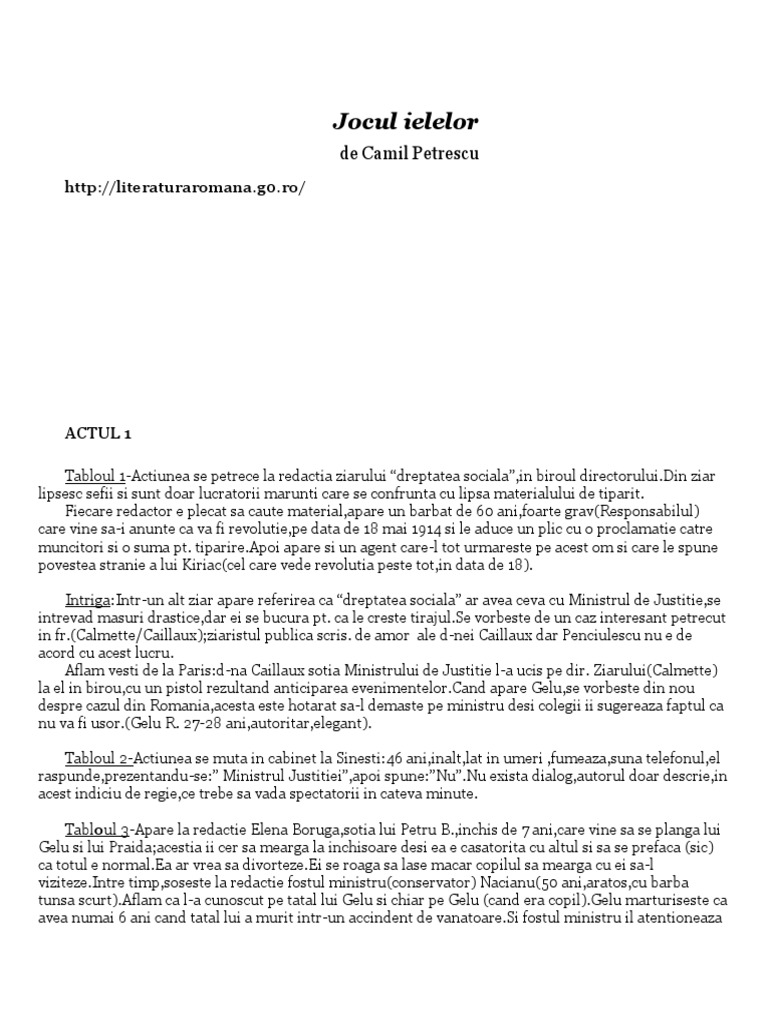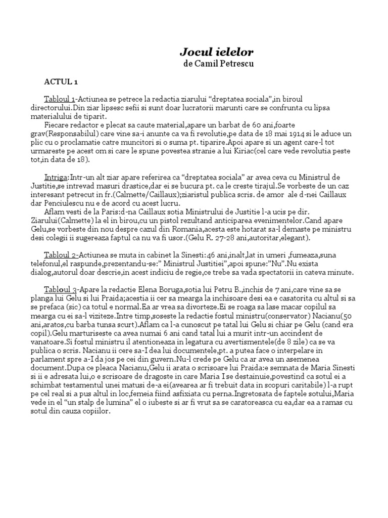 Actul 1 tabloul 1 actiunea se petrece la redactia ziarului dreptatea sociala in biroul directorului din ziar lipsesc sefii si sunt doar lucratorii marunti care se confrunta cu lipsa materialului de tiparit. Friday 28 august 2020 turda ioan ratiu 54 3 tel. Rezumat lung pe acte si tablouri la cartea jocul ielelor scris de romancierul si dramaturgul român camil petrescu. Jocul ielelor este prima operă dramatică a lui camil petrescu fiind considerată o dramă psihologică de idei ce aparține modernismului interbelic textul are ca temă problema adaptării intelectualului la condițiile mediocre ale societății camil petrescu aduce o noutate în literatura română prin abordarea unor probleme de actualitate cum ar fi.