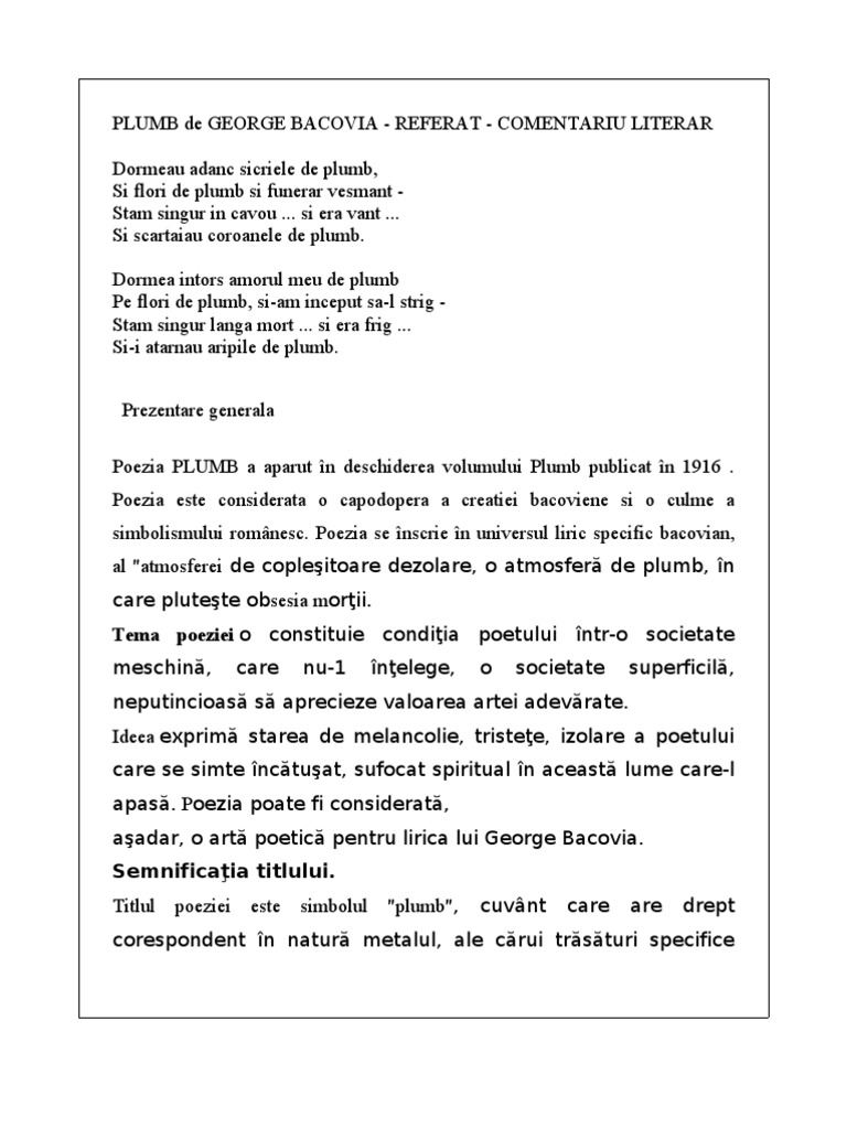 Poezia apare în 1916 în volumul cu aceelaşi nume. Plumb de george bacovia comentariu literar. Nu folosi acest material pentru a copia la examen. Poezia plumb deschide volumul cu același titlu apărut în anul 1916.