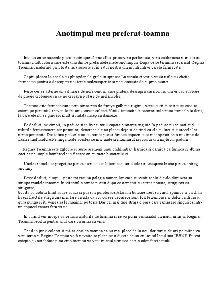 O compunere despre anotimpul toamna. Toamna dulce toamna cu frunzele toate flori george toparceanu aceste citate frumoase despre toamnă reprezintă doar un mic imbold pentru a ne bucura mai mult de anotimpul în care natura se transformă în cel mai talentat pictor. Un anotimp frumos cu multe recolte si multe bucurii. Ceața densă tocmai s a ridicat doar câteva urme din aburul răcoros mai persistă.