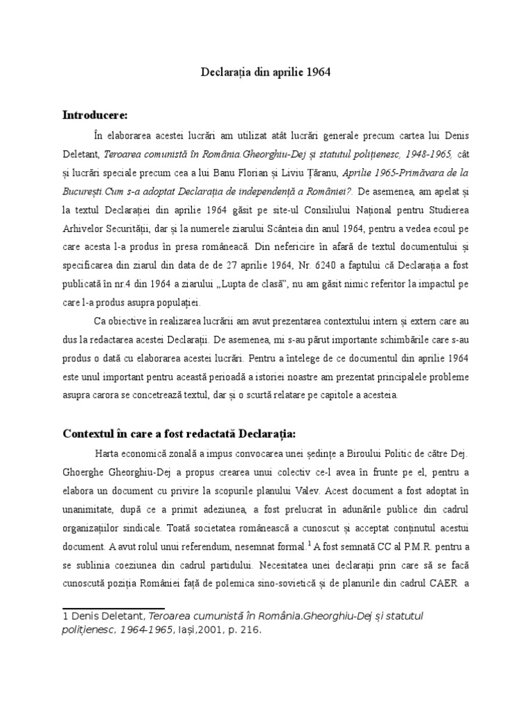 Gheorghiu dej i se recunosc unele succese în domeniul economic îndeosebi în ceea ce priveşte procesul de industrializare a ţării. De la retragerea trupelor sovietice la declarația din aprilie 1964 autor ioan scurtu 11426 vizualizări după retragerea armatei roșii din românia regimul de la bucurești a continuat să aducă elogii uniunii sovietice și conducătorilor ei a luat măsuri represive împotriva celor care se opuneau într o formă sau alta acestei orientări. Iulian cătălin nechifor romania si declaratia din aprilie 1964. în cazul declaraţiei din aprilie 1964 a supravieţuit în publicistica istorico politică dar şi în istoriografie un mit funest potrivit căruia acest document politic al partidului unic totalitar chiar este o declaraţie de independenţă faţă de moscova chiar reprezintă o primăvara de la bucureşti o întruchipare a destalinizării reale etc.
