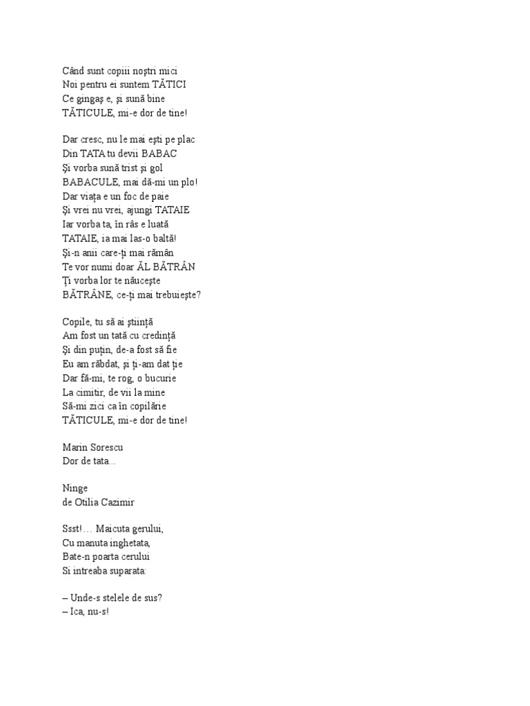 Poezia este scrisa de marin sorescu cu mici modificăriexprima sacrificiul patern si dragostea fata de prorii copii cum nu se poate mai bine si cere cred partea lor cu putina morala as putea spune si cere aceasi dragoste înapoi dar prea tirzii ceea ce te face sa plingi involuntar si instictiv de parca ai fi gresit si nu ti mai poti repara gresala si iti aduce aminte de acel ceva ceva de. Dor de tata marin sorescu. Eu am răbdat şi ţi am dat ţie. Tăticule mi e dor de tine.