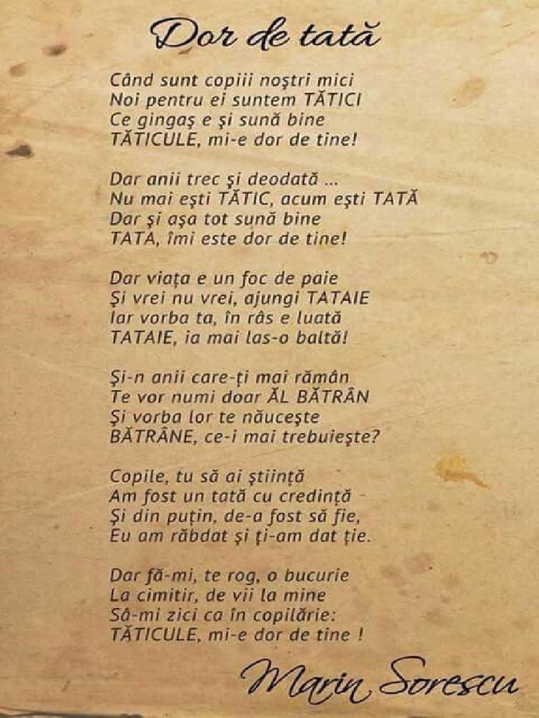 Dor de tată marin sorescu. Când sunt copii noştri mici noi pentru ei suntem tătici ce gingaş e şi sună bine tăticule mi e dor de tine. Când sunt copii noştri mici. Am fost un tată cu credinţă şi din puţin de a fost să fie eu am răbdat şi ţi am dat ţie. Tată îmi este dor de tine.