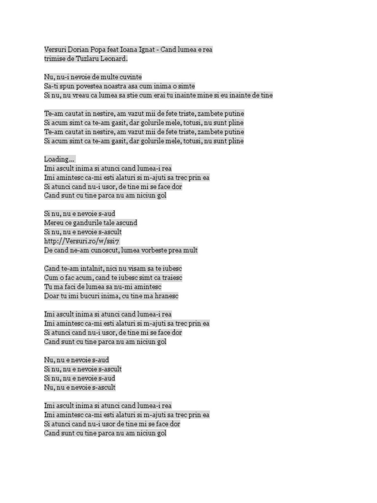 Versuri cand lumea e rea de dorian popa feat ioana ignat. Dupa piesa fierbinte de vara de. 64 09 mii azi. Dorian popa versuri cand lumea e rea te am cautat in nestire am vazut mii de fete triste zambete putine si acum simt ca te am gasit dar golurile mele totusi nu sunt pline te am cautat in nestire am vazut mii de fete triste zambete putine si acum simt ca te am gasit dar golurile mele totusi nu sunt pline dorian popa feat.