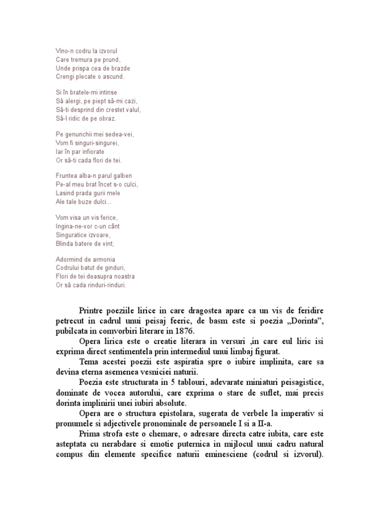 Manifestul unui popor și al unei țări pe care vecinii hrăpăreți au dorit să i îngenucheze și să i prăduiască. Poezia dorința de mihai eminescu exprimă bucuria și emoția adâncă la gândul întâlnirii cu persoana iubită în mijlocul naturii poetul prezintă visul de iubire curat pur posibil de împlinit. Si in. Poezia dorinţa a apărut în revista convorbiri literare la 1 septembrie 1876 împreună cu melancolie lacul şi crăiasa din poveşti din multele variante publicate de perpessicius deducem că poetul concepuse poezia ca o scrisoare de dragoste adresată iubitei şi semnată e.