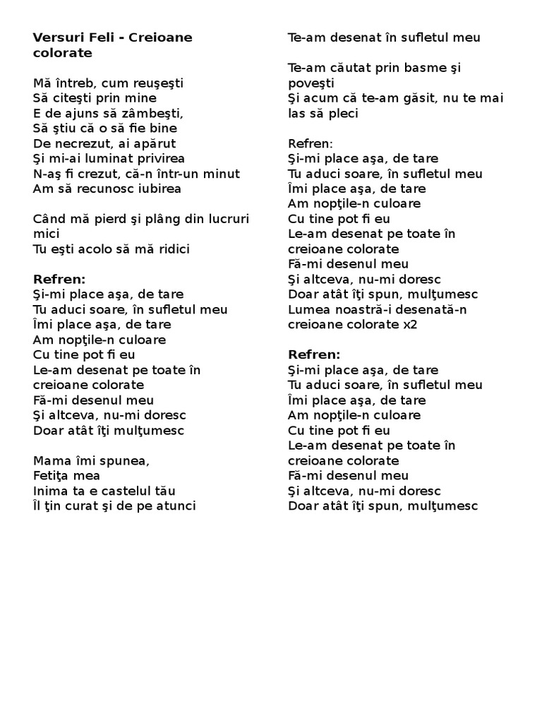 Feli creioane colorate official video by cat music hahaha production subscribe to romania s 1 music channel. Feli creioane colorate official video hd feli creioane colorate official video hd data adaugarii. 2 07 mii azi. Versurile melodiei creioane colorate interpretata de feli ma intreb cum reusesti sa citesti prin mine e de ajuns sa zambesti sa stiu ca o sa fie bine din necrezut ai aparut si mi ai luminat privirea n as fi crezut ca ntr un minut am sa recunosc iubirea cand ma pierd si plang din lucruri mici tu esti acolo.