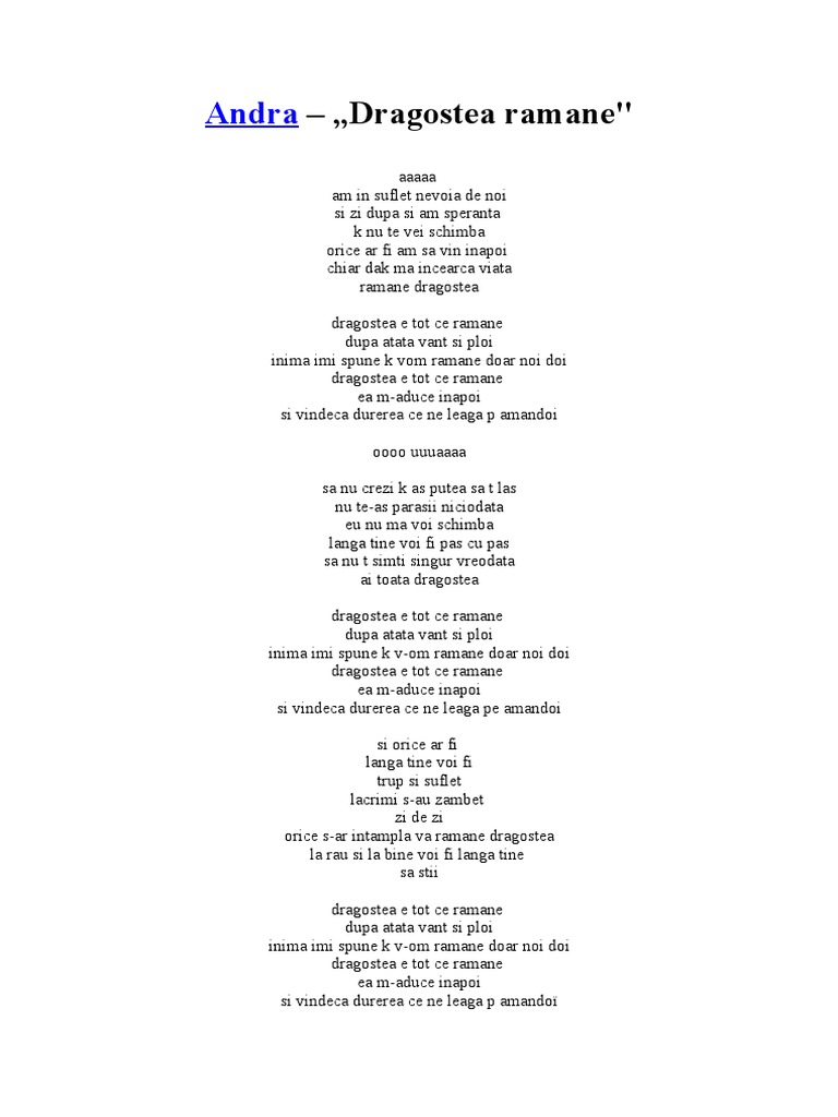 Dragostea e tot ce ramane versuri. şi orice ar fi lângă tine voi fi trup şi suflet lacrimi sau zâmbet zi de zi orice s ar întâmpla va rămâne dragostea. Noi si zi dupa si am speranta ca nu te vei schimba orice ar fi am sa vin inapoi chiar daca ma incearca viata ramane dragostea dragostea e tot ce ramane dupa atata vant si ploi inima imi spune ca vom ramane doar noi doi dragostea e tot ce ramane ea m aduce inapoi si vindeca durerea ce ne leaga pe. Simplu 06 andra de ai fi un inger feat. Versuri am in suflet nevoia de noi si zi dupa zi am speranta ca nu te vei schimba orice ar fi am sa vin inapoi chiar daca ma incearca viata ramane dragostea.