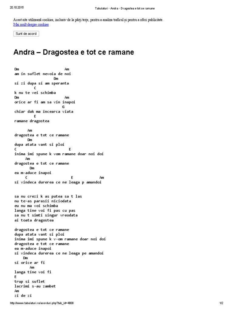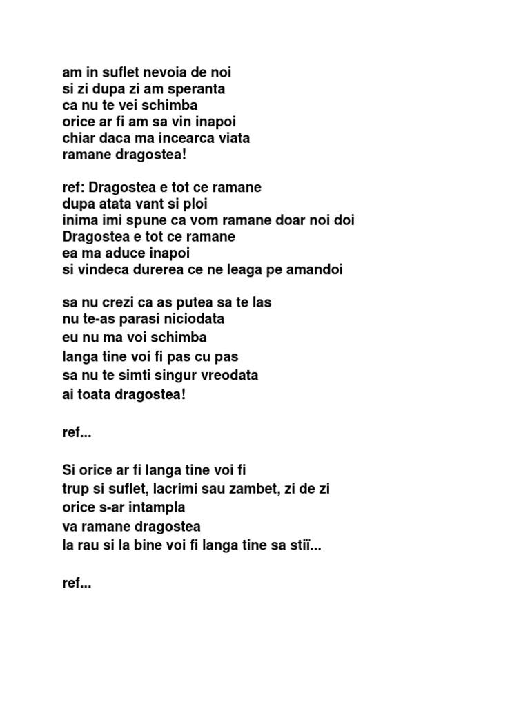 Dragostea e tot ce ramane. Dragostea e tot ce rămâne după atâta vânt şi ploi inima îmi spune că vom rămâne doar noi doi dragostea e tot ce rămâne ea m aduce înapoi şi vindecă durerea ce ne leagă pe amândoi. Simplu 06 andra de ai fi un inger feat. Dragostea e tot ce ramane ea ma aduce inapoi si vindeca durerea ce ne leaga pe amandoi sa nu crezi ca as putea sa te las nu te as parasi niciodata eu nu ma voi schimba langa tine voi fi pas cu pas sa nu te simti singur vreodata ai toata dragostea. We gathered and su.