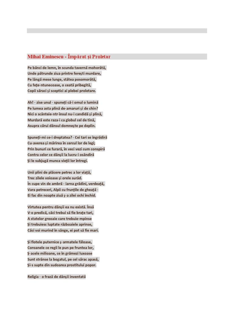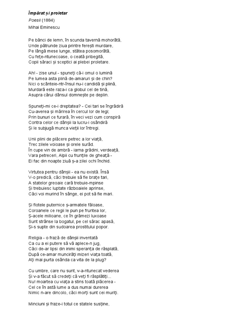 Eminescu imparat si proletar. Imparat si proletar de mihai eminescu poezie pe banci de lemn in scunda taverna mohorata unde patrunde ziua printre feresti murdare pe langa mese lunge statea posomorata cu fete ntunecoase o ceata pribegita copii saraci si sceptici ai plebei proletare. împărat şi proletar de mihai eminescu. Zise unul spuneti ca i omul o lumina. 1956 s a născut paul cook baterist britanic sex pistols the professionals.