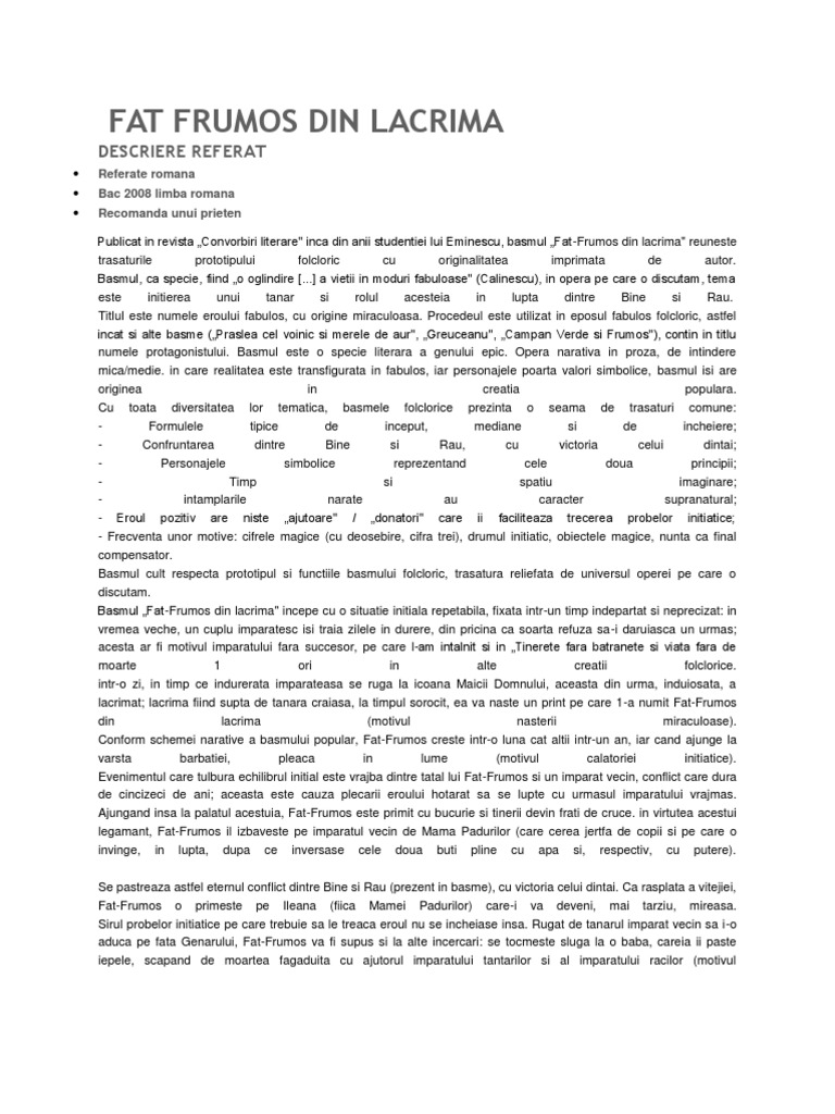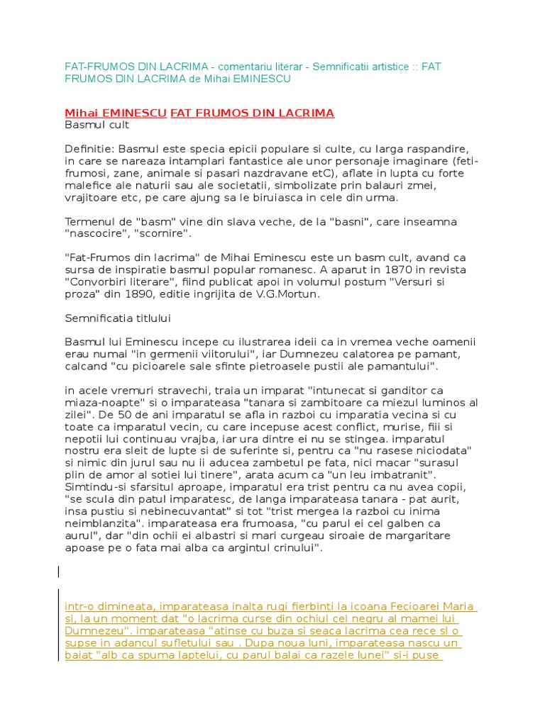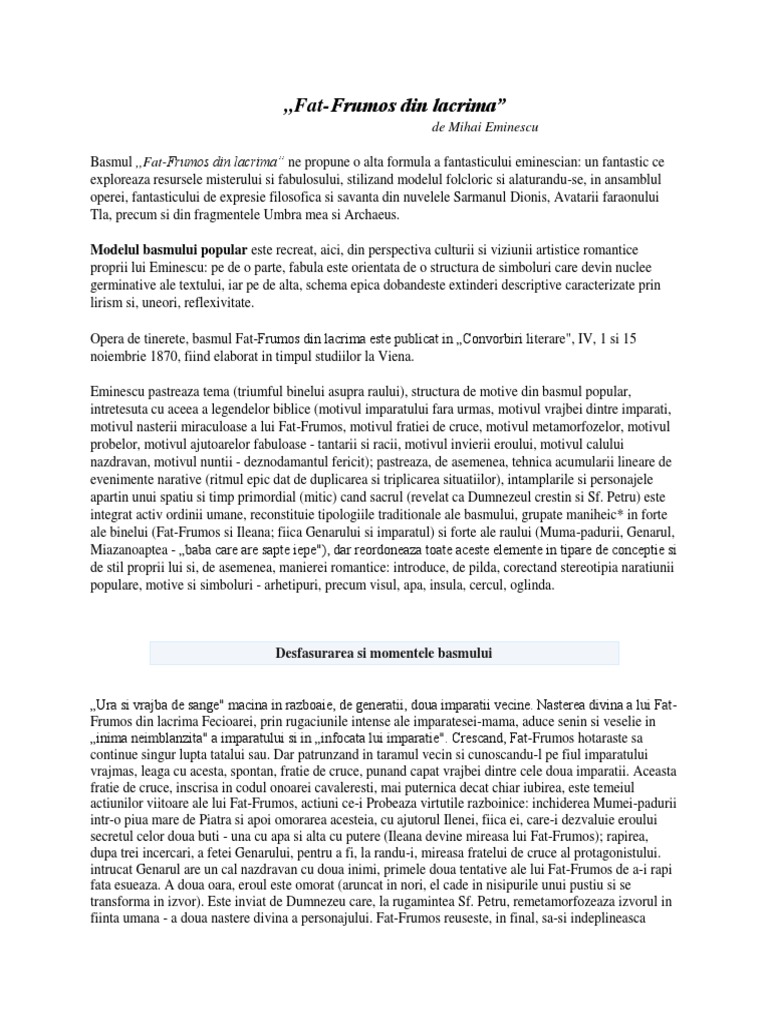 Este întotdeauna de apreciat dacă. Opera reuneste trasaturile prototipului basmului popular cu originalitatea imprimata de autor incadrandu se in categoria basmelor culte. Făt frumos din lacrimă este primul basm cult scris de mihai eminescu. Si i puse mama numele fat frumos din lacrima.