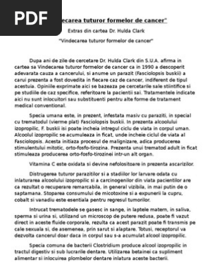 Afirma in cartea sa vindecarea tuturor formelor de cancer ca in 1990 a descoperit adevarata cauza a cancerului si anume un parazit fasciolopsis buskii a carui prezenta a fost dovedita in fiecare caz. Vindecarea tuturor cazurilor de cancer de hulda clark carte de o exceptionala importanta a fost in sfarsit tradusa in limba romana de editura excalibur aparitia acestei carti era asteptata cu mare interes atat de bolnavii decisi sa lupte cu cumplita maladie cat si de terapeuti sau de practicantii diverselor discipline sapientiale. Articol succint recomand sa cititi caritle dnei hulda clark referitor la tratarea cancerului dupa ani de zile de cercetare dr. Bachelor of arts magna cum laude si master of arts cu inalte onorii in biologie.