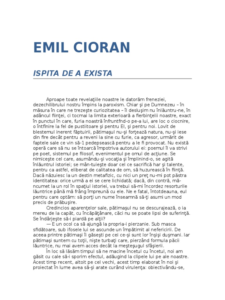 Emil cioran ispita de. Download ispita de a exista emil cioran pdf ebook si epub. Cartea ispita de a exista emil cioran in format pdf trebuie să învăţăm să gândim împotriva îndoielilor şi certitudinilor noastre împotriva umorilor atotştiutoare trebuie mai ales făurindu ne o altă moarte o moarte incompatibilă cu hoitul să acceptăm ceea ce nu poate fi dovedit ideea că ceva există. Please read our short guide how to send a book to kindle.