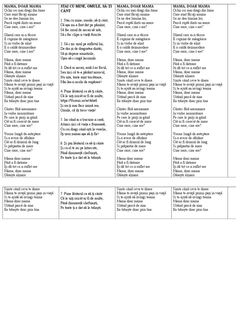 Mama doar mama gaseste alinare simte cand ceva te doare. Cel mai mare. Ochii cei mai dragi din lume care sunt facuti anume sa ne dea lumina lor parca i rupta dintr un soare cine oare cine i oare. Glasul care şi n tăcere e nvelit de mângâiere şi cu vorbe de alint e o caldă dezmierdare cine oare cine l are.