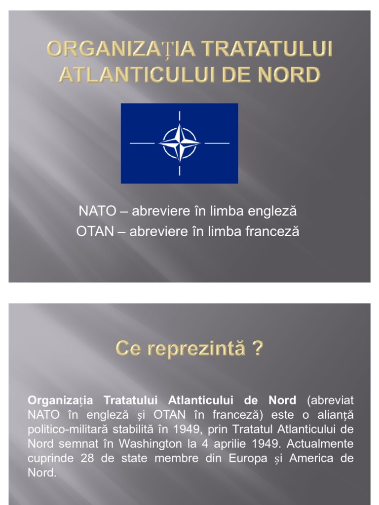 Organizația tratatului atlanticului de nord. Français 451 italiano 230 english 310 عربي 96 español 405 русский 67 deutsch 179 português 171 فارسى 48. Organizația tratatului atlanticului de nord. Organizația tratatului atlanticului de nord în engleză. Formarea nato organizația tratatului atlanticului de nord în 1949 a avut un răspuns direct la evenimentele din războiul mondial 2.