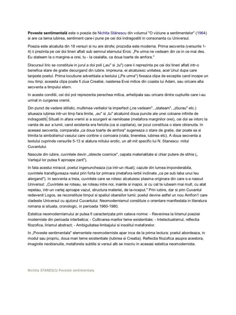 2 octombrie 2017 22 54. De nichita stănescu nichita stanescu 2009 08 04 înscris în bibliotecă de bot eugen iulian. învăţământ primar limba şi literatura român ă. Eu stateam la o margine a orei tu la cealalta ca doua toarte de amfora.