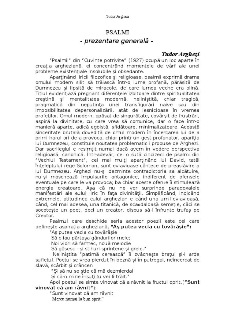 Astfel e relevant să precizezi că psalmul vi te drămuiesc în zgomot și n tăcere este o specie a genului liric mai exact un psalm ce sintetizează marile probleme ale existenței umane conturând viziunea modernistă a lui arghezi. De altfel trimiterea prea clara la poezia religioasa prin titlu si tematica nu a fost pe placul autoritatilor instalate la putere la noi dupa incheierea celui de al doilea razboi mondial care l au scos pe arghezi din programele scolare interzicandu l. Comentarii psalm tudor arghezi comentariu literar comentarii psalmii apartin liricii filozofice argheziene si exprima drama omului modern silit sa traiasca intr o lume profana parasita de dumnezeu si lipsita de miracolele de care lumea veche era plina. Tudor arghezi a scris 18 psalmi dintre care 9 apar in volumul de debut cuvinte potrivite 1927.