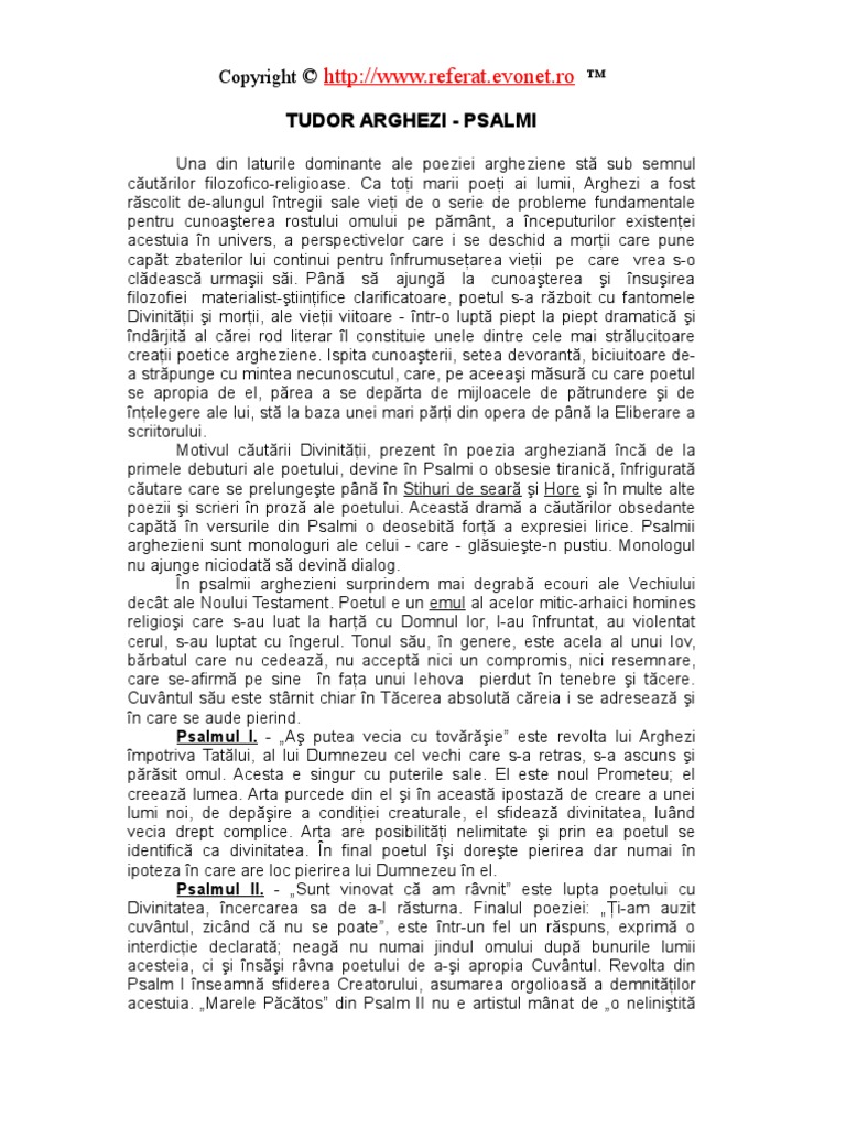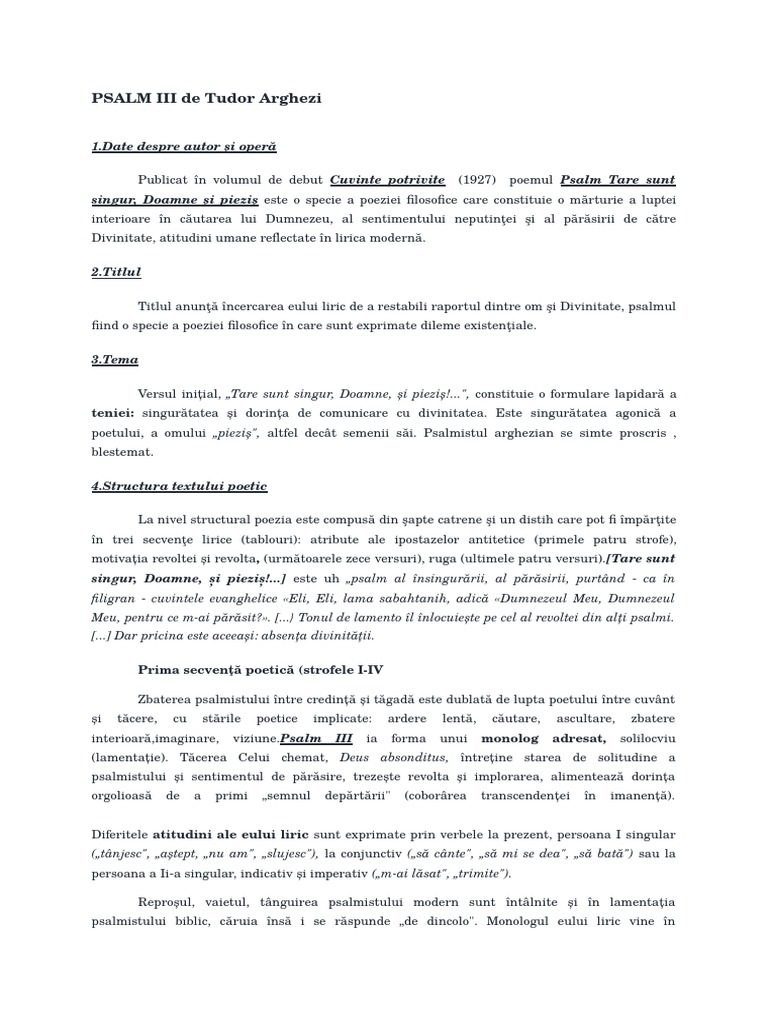 Psalm tudor arghezi comentariu. Date despre autor tudor arghezi este un poet modernist ca si lucian blaga si ion barbu apartinand perioadei interbelice a literaturii el revolutioneaza limbajul poetic al vremii sale in raport cu mijloacele de expresie traditionale fiind de parere ca acesta are menirea de a l face pe cititor sa simta ceea ce citeste iar o idee sa nasca sute altele in 1927 publica volumul de debut intitulat. Cercasem eu cu arcul meu sa te rastorn pe tine dumnezeu. Increderea umi linta proslavirea lui dumnezeu cei mai vechi psalmi au fost atribuiti regelui evreu david si apar in vechiul testament. Psalmul este o specie a genului liric poezie religioasa cu caracter imnic.