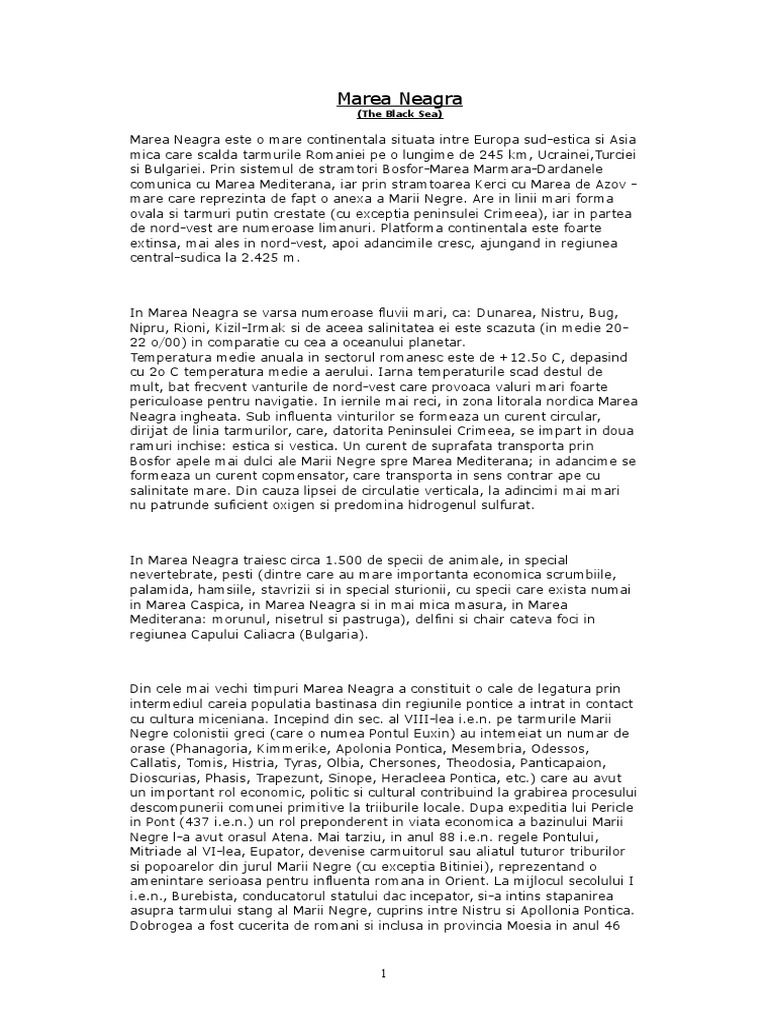 Marea neagra compunere biserica neagra referat gaura neagra delta dunarii si marea neagra delta s a format pe parcursul a peste 16 000 ani si reprezinta cel mai mare sistem de purificare a apei din europa filtrind apa dunarii la intrarea acesteia in marea neagra. Marea neagra este o mare continentala situata intre europa sud estica si asia mica care scalda tarmurile romaniei pe o lungime de 245 km ucrainei turciei si bulgariei. Locarizarea mării negre marea neagră este o mare continentală situată între europa sud estica şi asia mică la care au deschidere ucraina rusia georgia turcia bulgaria şi românia. Ea este un rest al marii sarmatice si prezinta o serie de aspecte unice in lume.