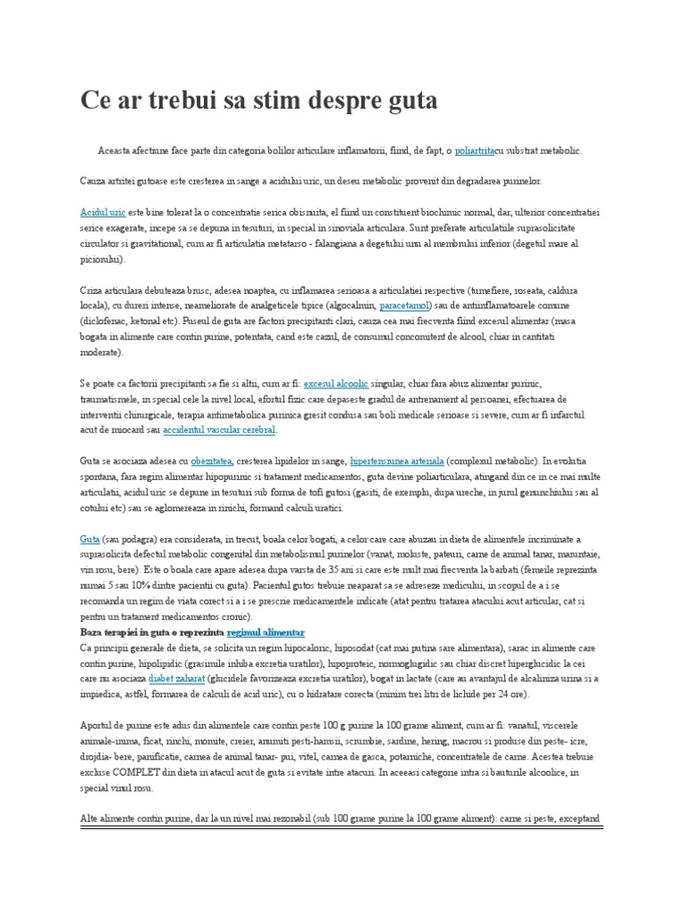 Regim special pentru guta. Guta este o formă dureroasă de artrită care în trecut era considerată boala oamenilor bogați care consumau foarte multă carne de vânat bogată în purine. Astfel dieta pentru guta de multe ori nu este suficienta fiind nevoie si de un tratament medicamentos pentru controlul nivelului seric al acidului uric si al bolii. De aceea dieta recomandata pentru persoanele care sufera de guta este destul de greu de urmat. Recomandari igieno dietetice pentru persoanele cu guta author.