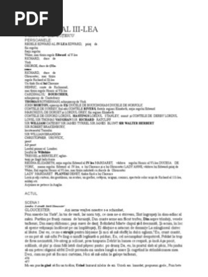 Richard al 3 lea rezumat. Richard este fratele regelui edward al iv lea și al lui george duke de la clarence și el este hotărât să ia tronul și să distrugă pe toată lumea pe calea sa pentru a se asigura că rămâne în siguranță. Richard al iii lea este una din piesele de tinerețe ale lui shakespeare care a fost jucată prima oară la londra aproximativ în 1593. După moartea fratelui său regele eduard al iv lea richard a domnit ca regent pentru fiul lui eduard. Dar de atunci până azi personajele în frunte cu richard însuși nu și au pierdut nimic din fascinația pe care au avut o acum mai bine de 400 de ani richard face parte din seria de așa ziși monștri amorali shakespearieni împreună cu iago.