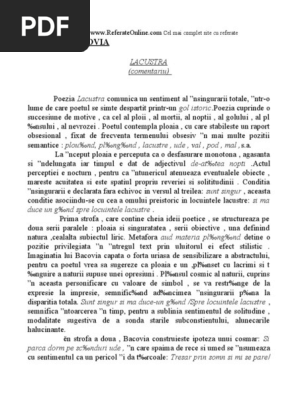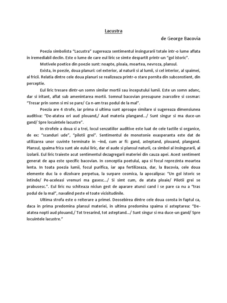 Sunt tresar si la nivelul expresiei prin pauzele afective conferite de cezura si de punctele de suspensie. Viziunea despre lume sta sub semnul conceptiei despre literatura a lui liviu rebreanu. Tema specific bacoviana este dezagregarea cosmica si regresiunea in haosul primordial amorf descompunerea spiritului sub efectul ploii. In lacustra viziunea despre lume surprinde o existenta fara iesire nemetafizica.