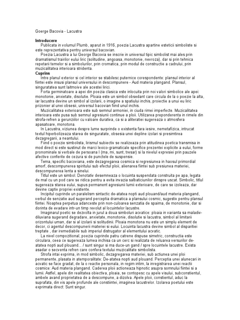 Poezia lacustra apare in volumul de debut intitulat plumb publicat in 1916 axndu se pe ideea centrala a conditiei nefericite a creatorului poezia este o arta poetica in care se evidentiaza un ansamblu de trasaturi care compun viziunea despre lume si viata a unui autor despre menirea lui in univers si despre misiunea artei sale intr un limbaj literar care il particularizeaza.