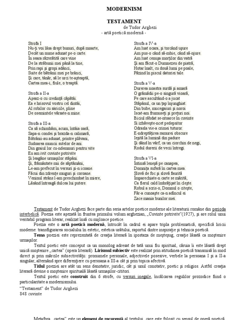 Testament de tudor arghezi face parte din seria artelor poetice moderne ale.