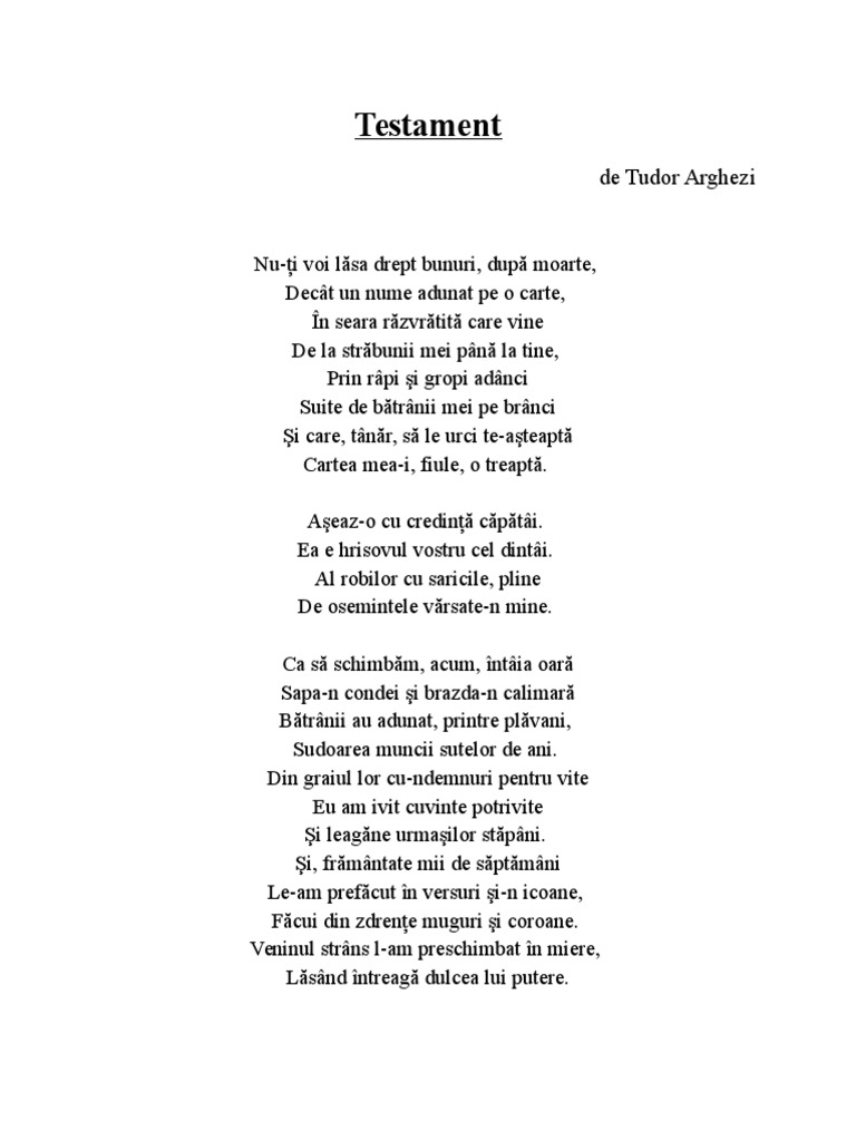 Testament de tudor arghezi versuri. Testament este o poezie modernistă ce deschide volumul de versuri cuvinte potrivite 1927 fiind o artă poetică modernă ce sintetizează crezul artistic arghezian concepția despre. Tudor arghezi este un poet modern ce impune un nou model de poeticitate întemeiat pe logică artistică voit paradoxală și pe diversitatea registrelor stilistice trecând de la sublim la abject. Versuri testament de tudor arghezi. Nu ţi voi lăsa drept bunuri după moarte decât un nume adunat pe o carte.