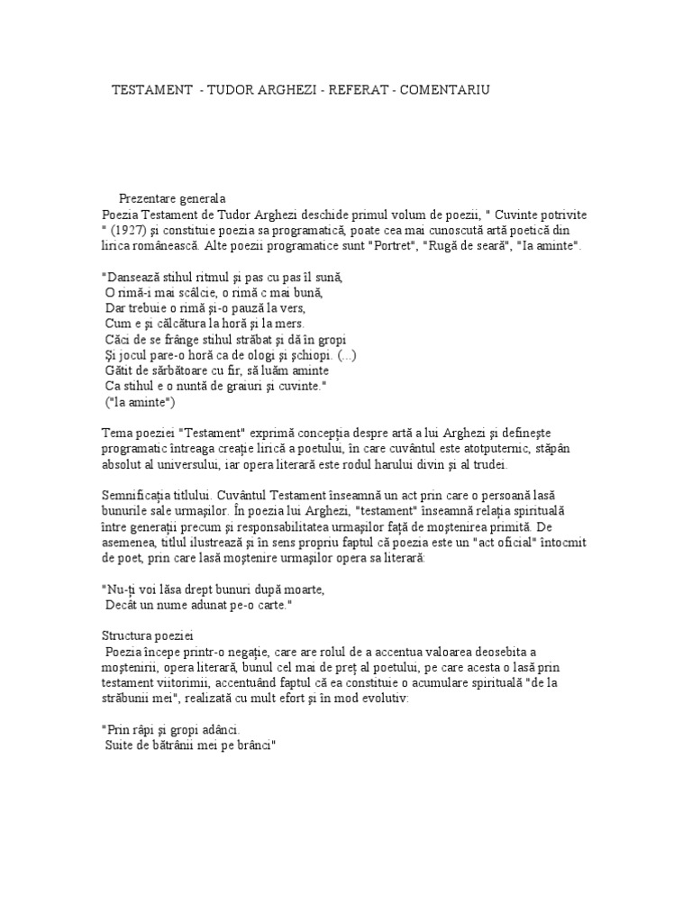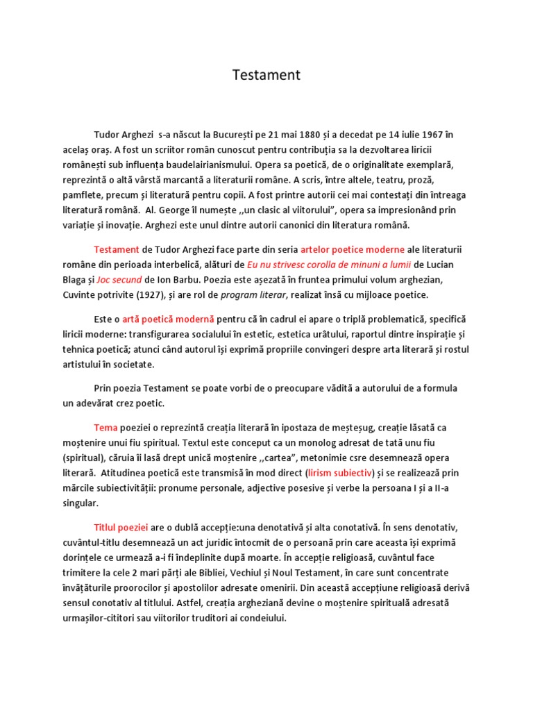 3 testament face parte din seria artelor poetice moderne ale literaturii romane din perioada interbelica. Testament de tudor arghezi modernismul comentariu bac. Perioada interbelica lanseaza in literatura romana o serie de poeti si scriitori care imbratiseaza curentele moderne aduse de schimbarea culturala si in spatiul autohton. Opera sa poetica de o originalitate exemplara reprezinta o alta varsta marcanta a literaturii romane.