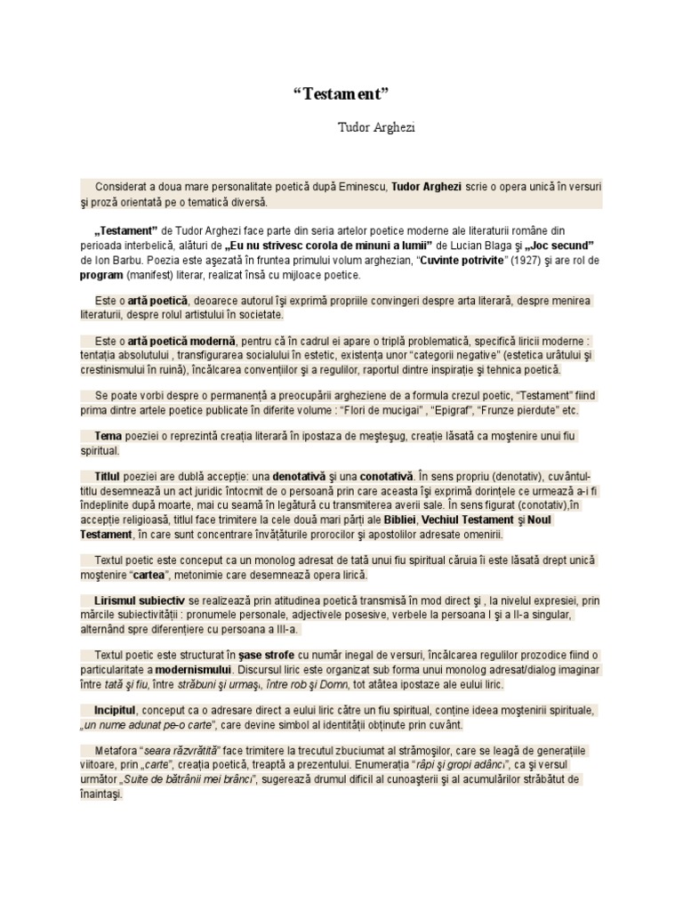 Formularea ipotezei testament de tudor arghezi face parte din seria artelor poetice moderne ale literaturii române din perioada interbelică alături de eu nu strivesc corola de minuni a lumii de lucian blaga şi joc secund de ion barbu. Eseu tudor arghezi testament. încadrare într un curent specie. Perioada interbelica lanseaza in literatura romana o serie de poeti si scriitori care imbratiseaza curentele moderne aduse de schimbarea culturala si in spatiul autohton.