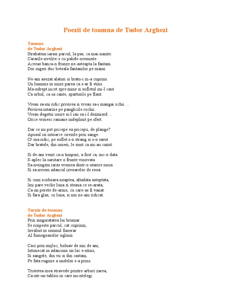 Poezii de toamna de tudor arghezi toamna de tudor arghezi strabatem iarasi parcul la pas ca mai nainte. Tonul melancolic exprimă ideea timpului ce se scurge ireversibil şi implacabil pentru om pe măsură ce zilele vieții trec. Tudor arghezi ion n. Ne am asezat alaturi si braţu i m a cuprins.