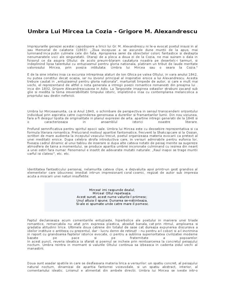 Umbra lui mircea la cozia poezie. Dintr o peşteră din rîpă noaptea iese mă mpresoară. Umbra intră în mormânt. De pe muche de pe stinca chipuri negre se cobor. Catre tarmul dimpotriva se intind se prelungesc s ale valurilor mindre generatii spumegate zidul vechi al manastirei in cadenta il izbesc.