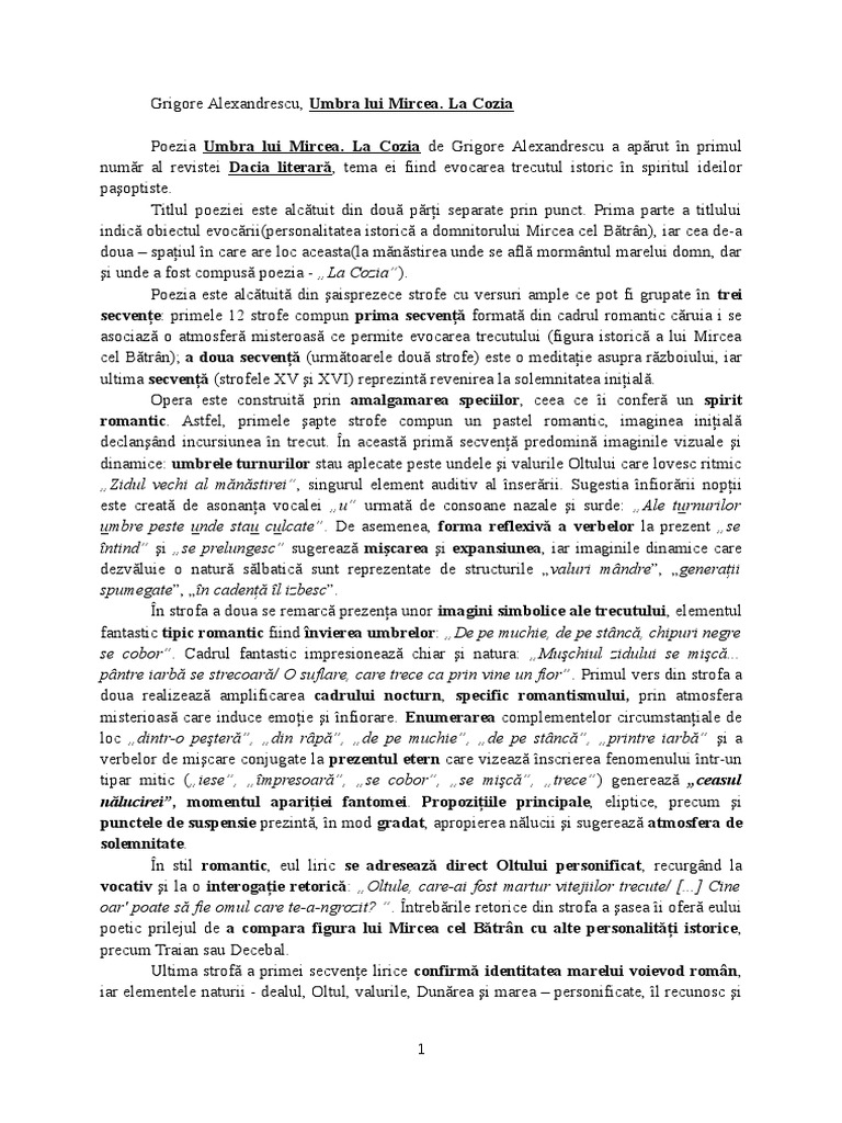 Unul altuia il spun dunarea se nstiinteaza si ale ei spumate unde catre mare pornesc. Dintr o pestera din ripa noaptea iese ma mpresoara. Catre tarmul dimpotriva se intind se prelungesc s ale valurilor mindre generatii spumegate zidul vechi al manastirei in cadenta il izbesc. Poezie umbra lui mircea la cozia de grigore alexandrescu.